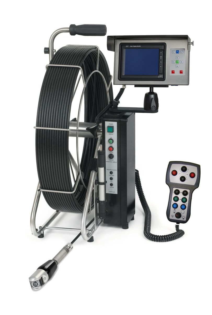 Schwenkkopf-Farb-TV-Schiebekamera für Untersuchungen ab DN 80 bis DN 200. 87° bogengängig ab DN 100
